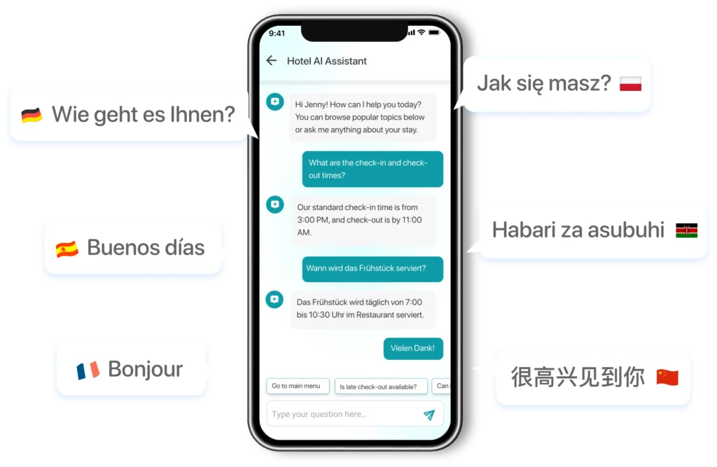 Smart automation handles common questions instantly, while your staff step in for more complex requests. Guests do not need to call or queue at the front desk. They simply open the app, send a message and get fast, accurate support.
