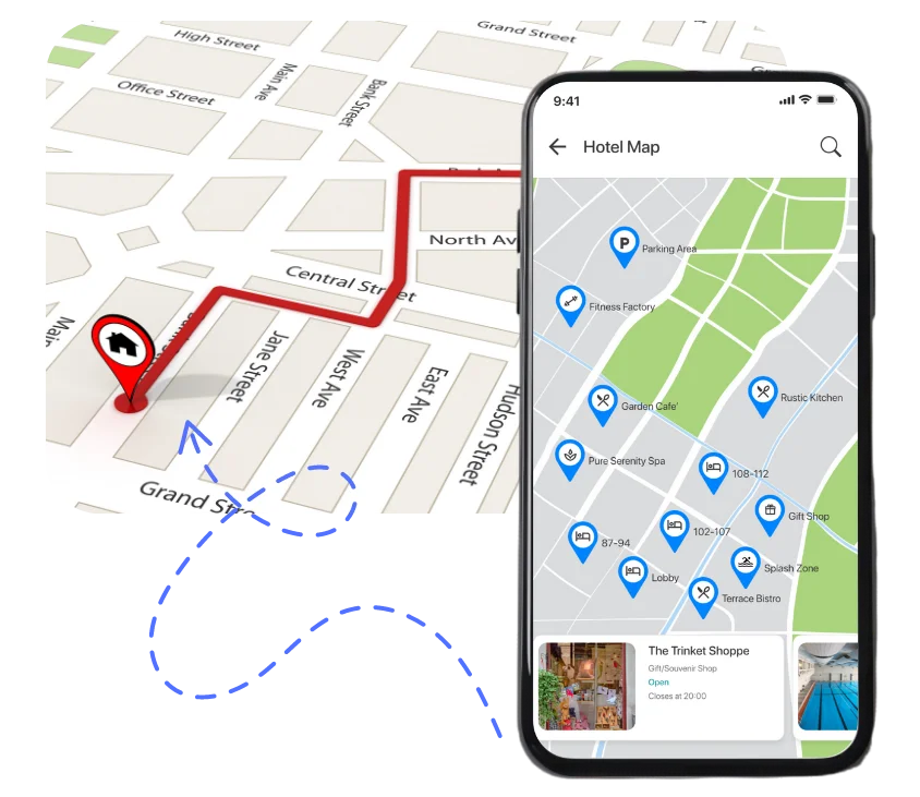 Guests open the map, see exactly where they are and how to reach the next place they want to go. No more guests wandering the corridors or repeatedly asking for directions.