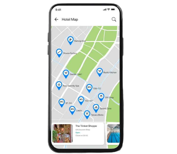 The SOPAGO Hotel Map is an interactive, mobile friendly map inside the Guest App that shows guests how to move around your property. It highlights rooms, restaurants, pools, spa and other facilities, making wayfinding easier and more intuitive.