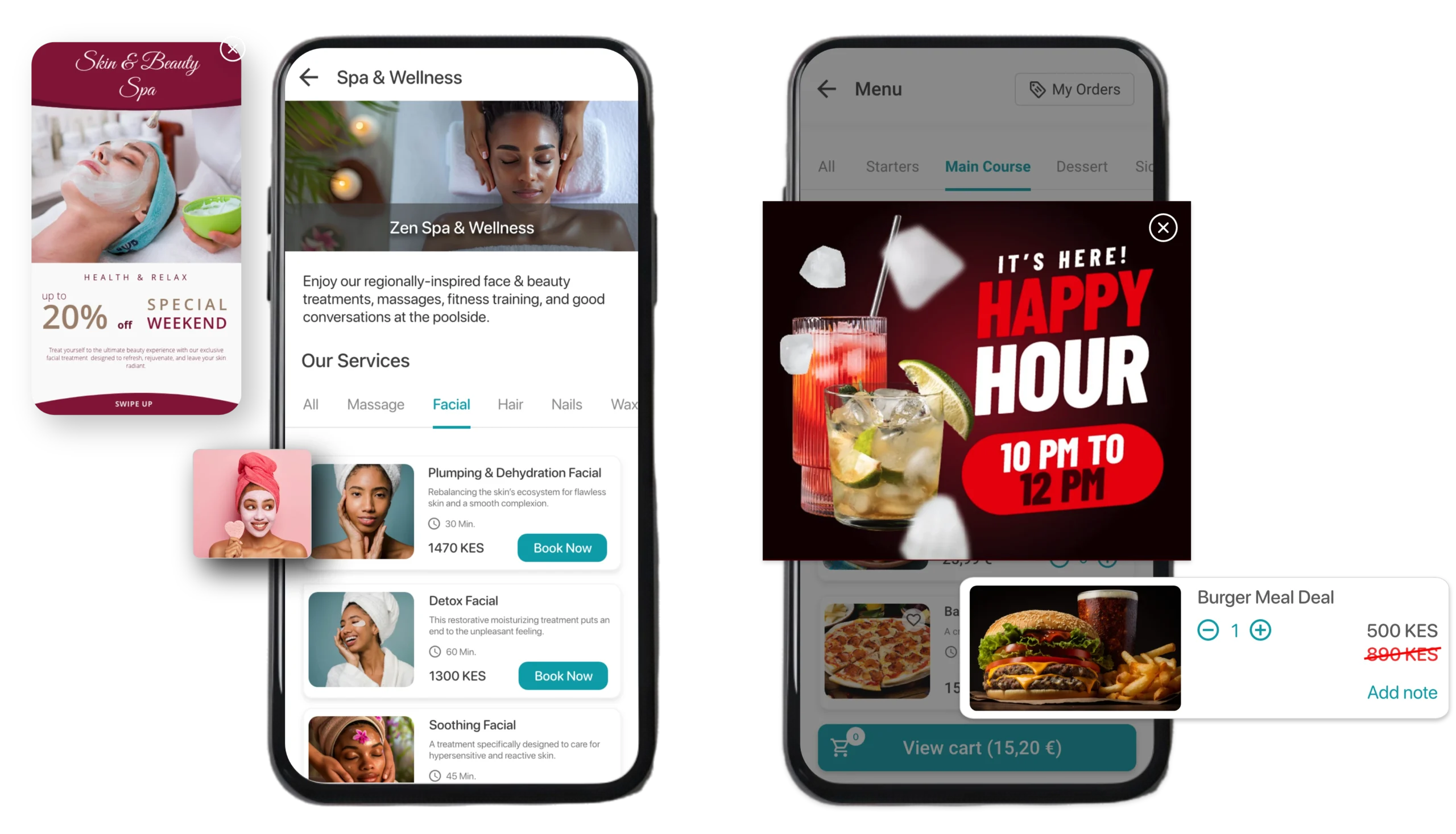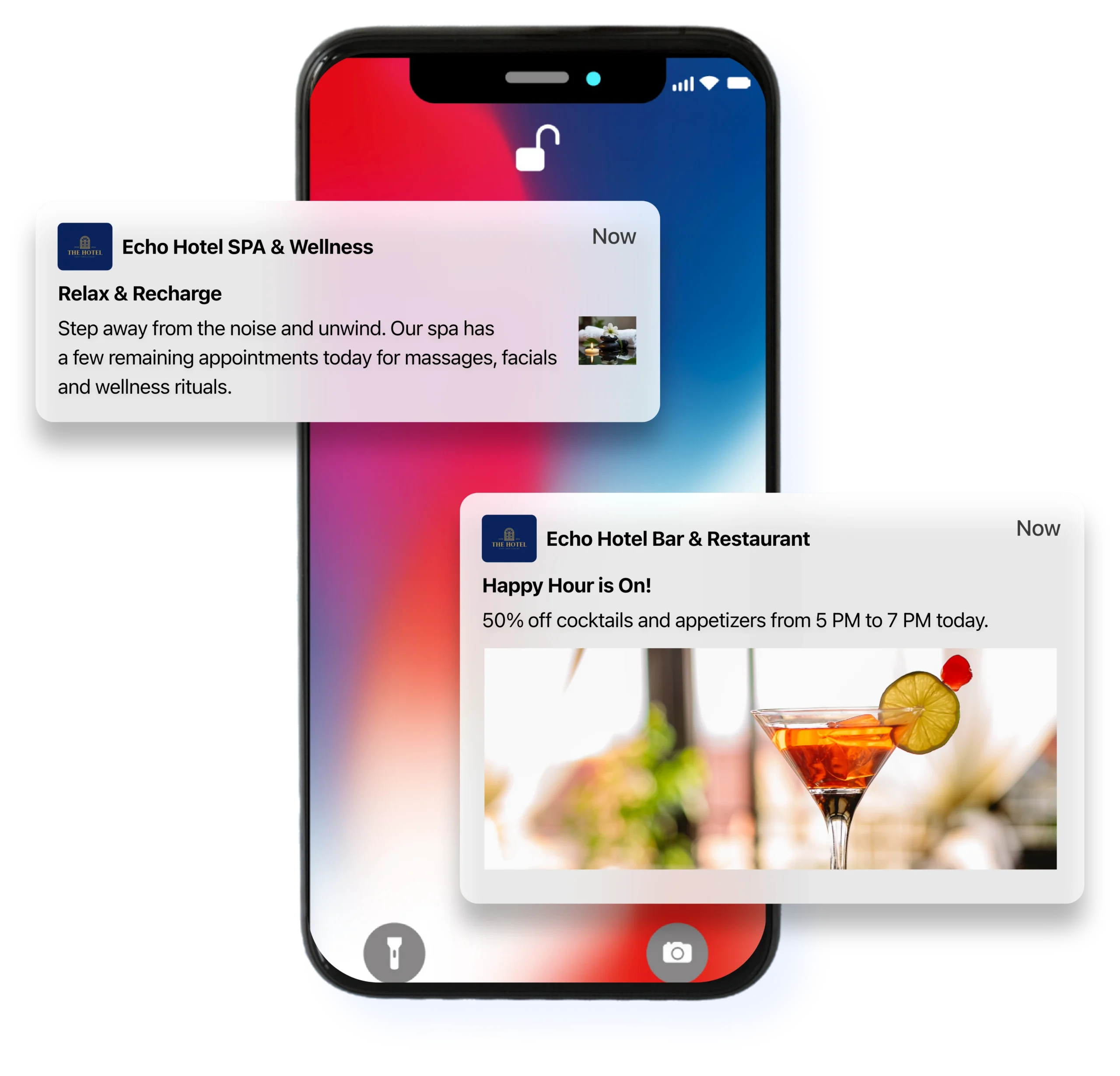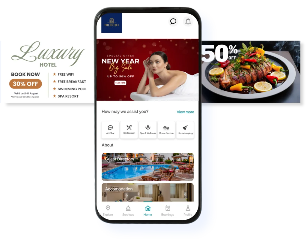 Instead of generic flyers or notices at reception, your promotions appear where guests already are, on their phone, with clear calls to action and instant booking.